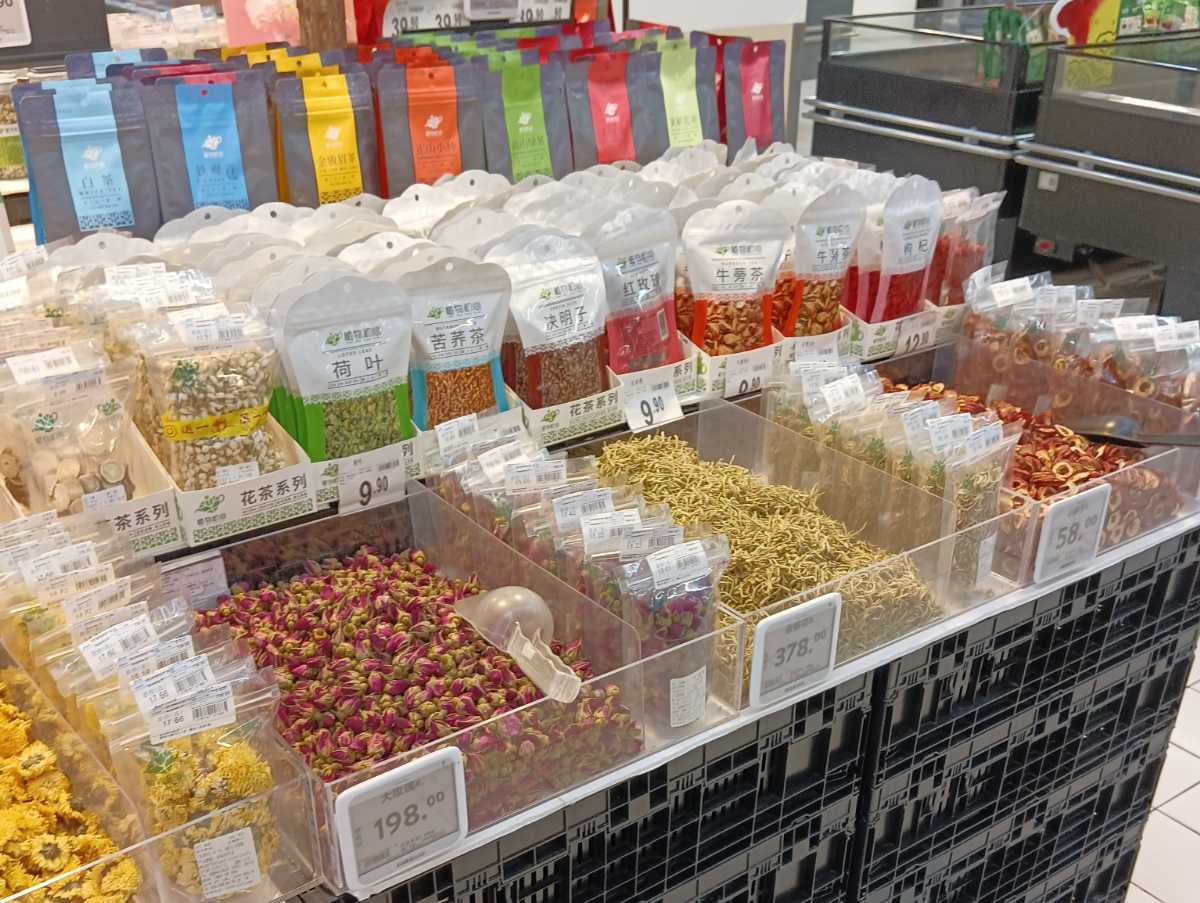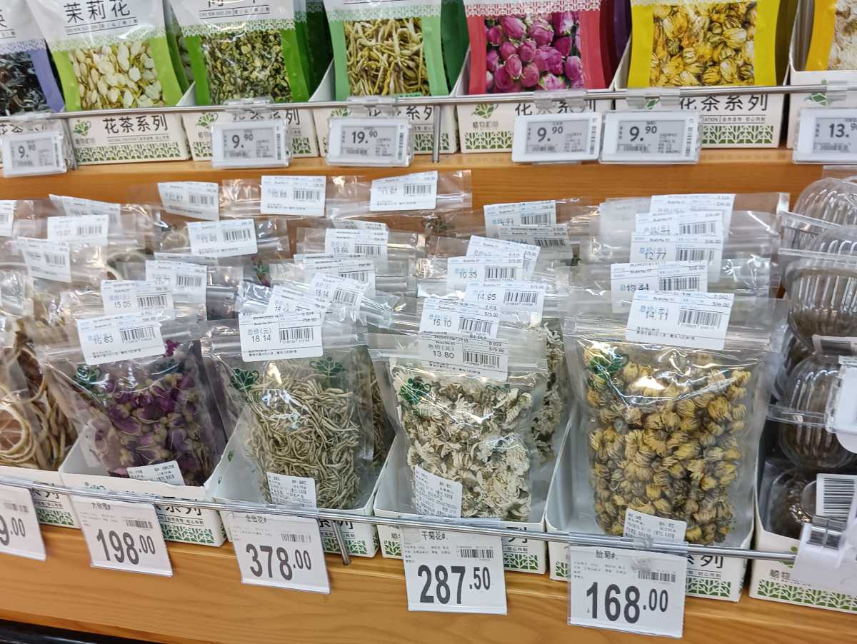 中国は、さすがにお茶の本場だけあって、とにかくお茶の種類は豊富です。こちらは、花茶系列で「菊花茶」「玫瑰茶(バラ茶)」など。その他、聞いたこと無いようなお茶が結構あります。自分が飲んでいるのは「ジャスミンティー(茉莉花茶)」くらいかな。