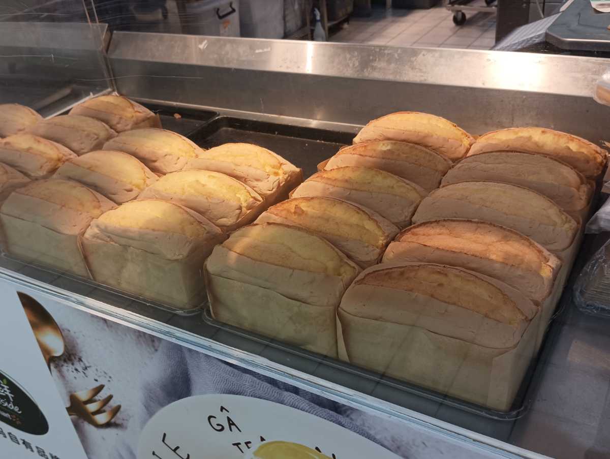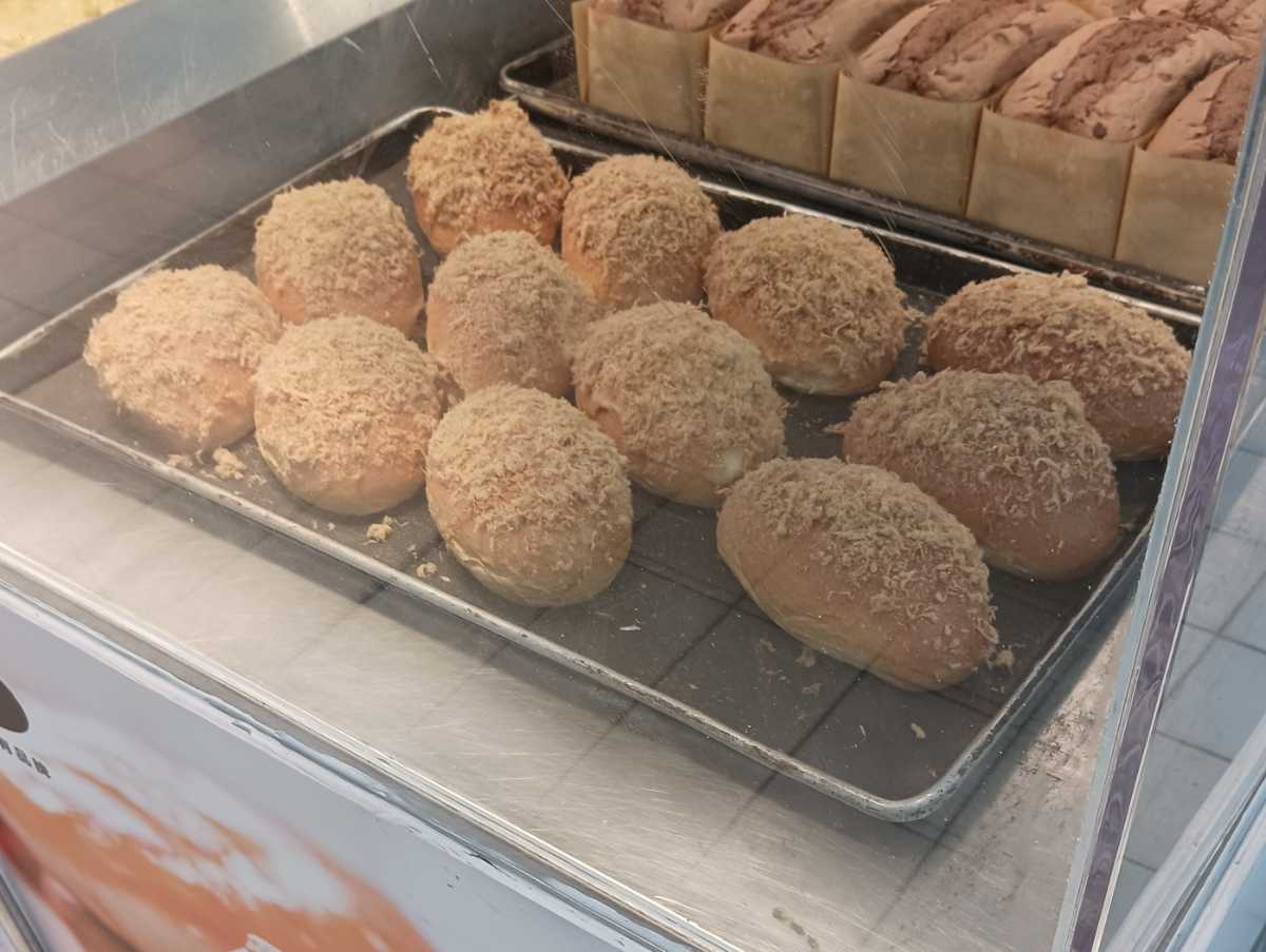 その他、焼きたてのものは、ガラスケースの中に、鉄板の上に載ってます。中国人大好き、肉松パン、ふわふわで甘い食パン(甘食みたいな甘さ)