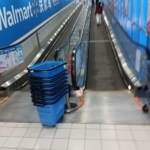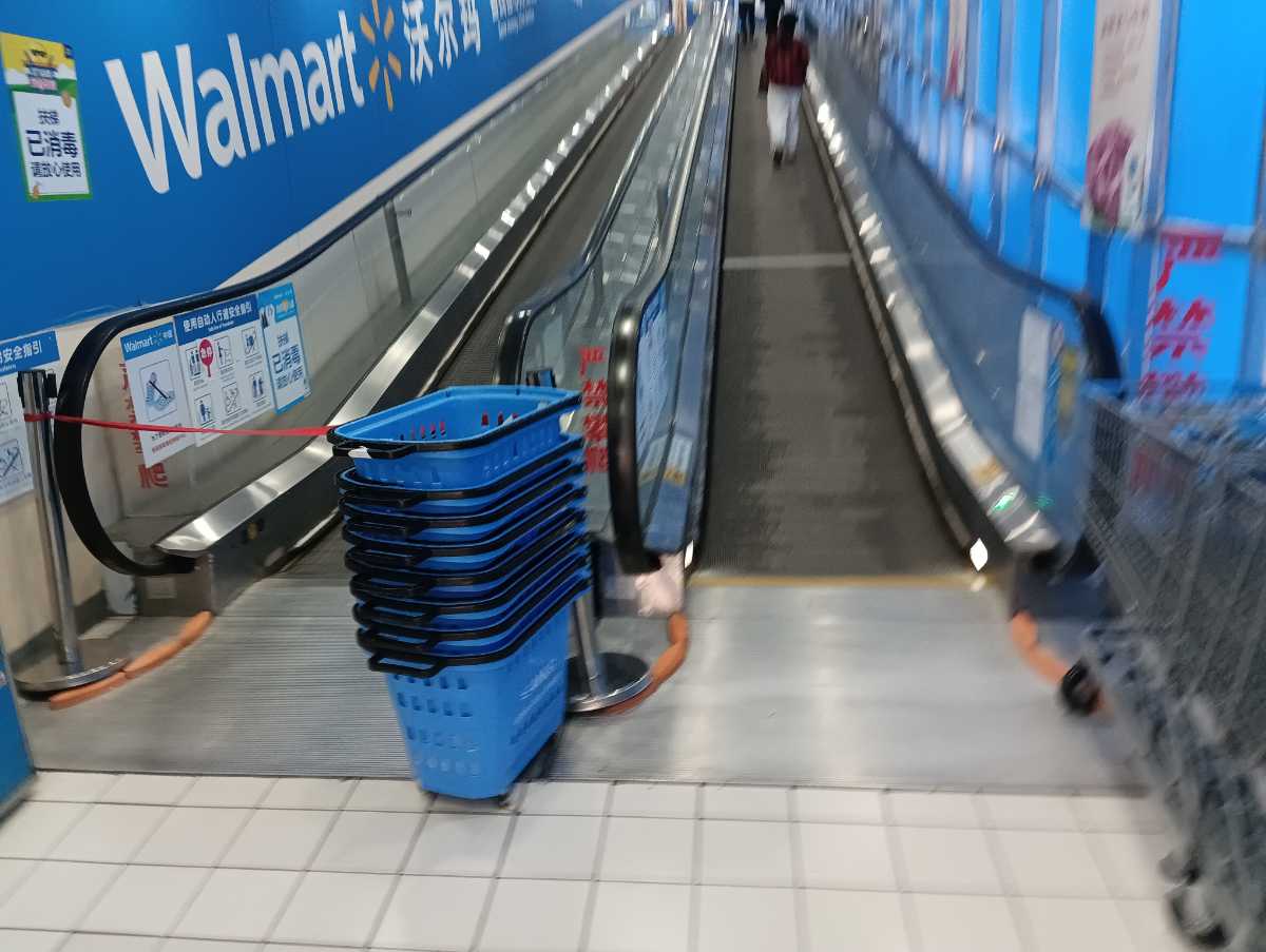 店の門のまん前に車や自転車が駐車してあったりと、雑然とした感じが、いかにも中国のウォルマートですね。とりあえず、右側にスロープがあったので、先に二階に上がります。こちらは、カートごと移動するという、アメリカンなスタイル。