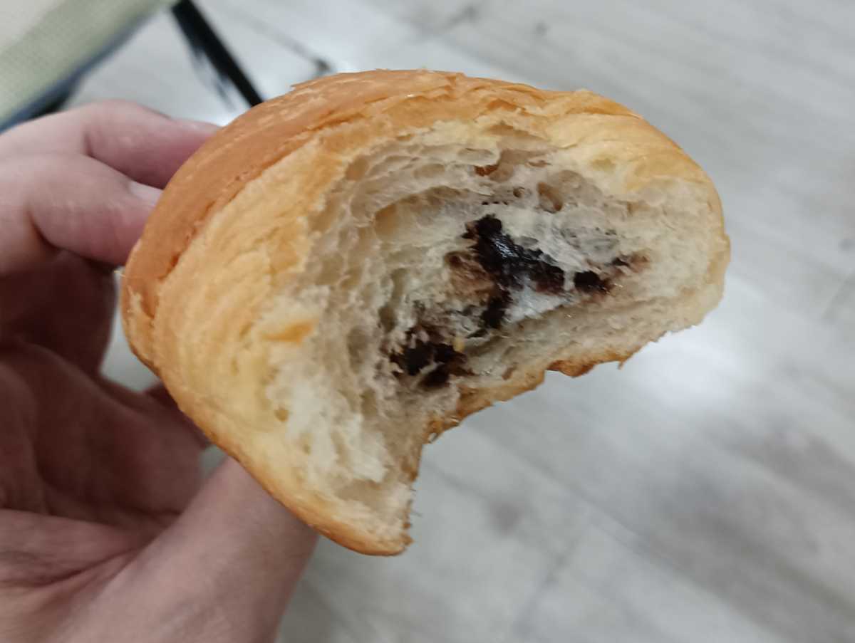 早速、購入して、食ってみましたが、やはり残念感は否めないですね。まず、外見からして、そもそも三角形じゃないし、チョコも見えてない。しかも、生地がクロワッサン風で、チョコも固くておいしくない。