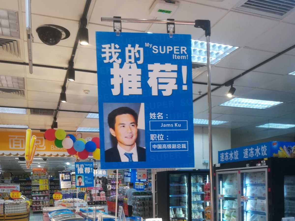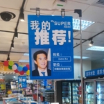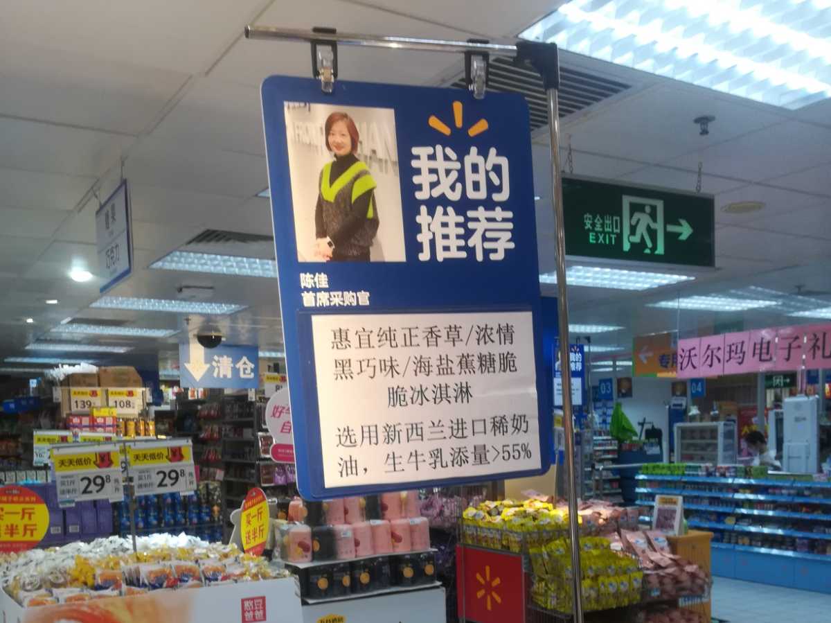 あと、店員の制服が、ポロシャツとジーンズとか(店による)、ちょっとアメリカンな感じで、接客とかも、イオンとかと比べると、いろいろ違うので面白いです。また、ボードを使って、店員さんからのオススメ商品(我的推荐)をフィーチャーしてます。