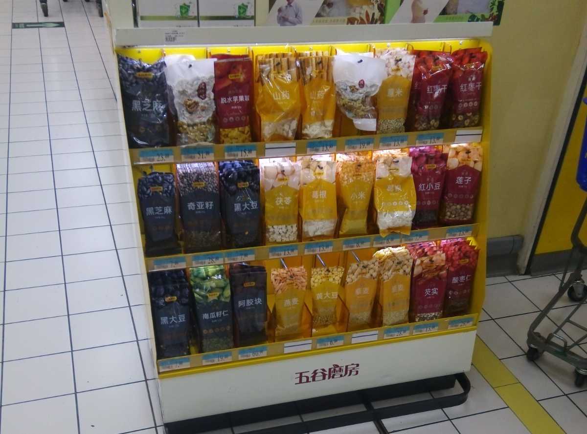 中国スーパー謎?のコーナー。係員のおばちゃんが「現磨、現磨・・(挽きたてですよー)」といって呼び込みをしていて、香ばしい香りをさせています。どうも、豆や穀物類(莲子,黑芝麻,黄大豆,燕麦,红枣干,葛根・・・)を、ローストしてくれるようです。ちなみに「五谷磨房」は自然健康食品のブランドで、ペプシコが出資しているようです。