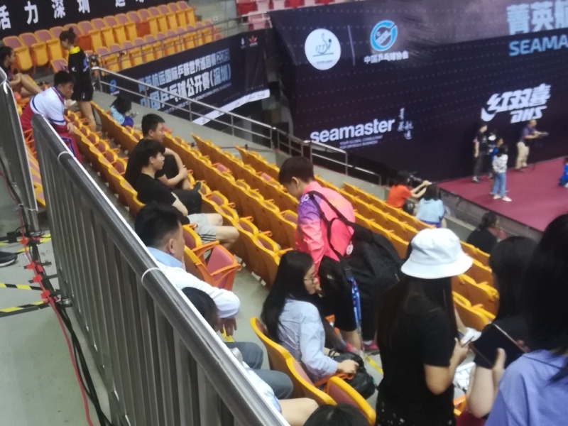 客席を立ち去る孫穎莎選手(だと思う)。この頃の中国の卓球会場は、一般客と関係者の席が分けられておらず、座席の指定も自由という超ゆるゆる状態でしたので、選手や監督が、客席をうろうろしていることもよくありました。